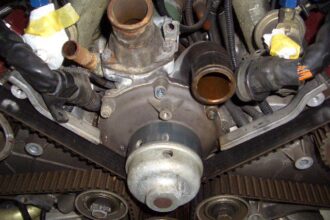 フェラーリF348のタイミングベルト交換の続きになります。 今回はウォーターポンプから水漏れもあったのでタイミングベルトを組み付ける前に同時に交換していきます。 右の画像の左側が新品になります。 タイミングベルトカバーの…