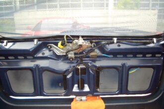ハッチを開けないと始まらないので室内から内張りを剥がし直接ロックを動かしハッチを開けます。 ドアノブでロックを解除しようとノブを動かしてみますがスカスカで感触がありません。 ノブからロックまでのリンクの動きを見てみると…