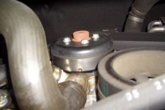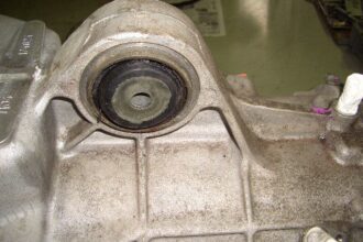 今回はメルセデスベンツE240のウォーターポンプ交換を紹介したいと思います。 こちらの車輌は走行中にエンジンルーム内からガタガタと音がするということで入庫しました。 車輌の下側からウォーターポンプを写した画像です。 LL…