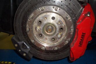575Mのブレーキ交換の仕事が入って着ました。 以前当社で550用で製作したブレーキを手に入れたので取り付けて欲しいとの事です。 まず純正のブレーキキャリパーと、ブレーキディスクを取り外して、仮合わせを行います。 この状…