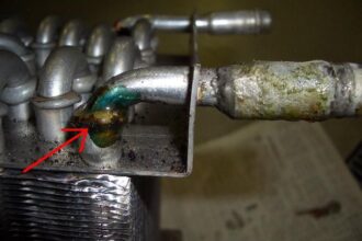 今日は、前の続きで、328の水漏れ修理の模様を書こうと思います。 前回、ヒーターコアを外した所まで書きましたが、 ヒーターコアを以前に修理した跡があり、そこから水が漏れていました。 エポキシ系のボンドで漏れを止めています…