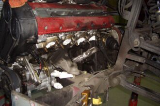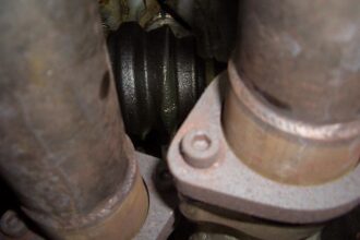 タイミングベルトの交換作業をしている355なのですが、エンジン廻りの作業は終了して、エンジンを 車両に乗せる途中での作業ですが、エキゾーストパイプのクランプが割れちゃっていたので交換しました。 現車の割れていたエキゾース…