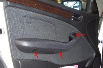 今日は、BMW320のパワーウィンドーレギュレーターの 交換作業を紹介したいと思います。 まず、矢印の3箇所のネジを外します。 次に、木目のパネルを外し、矢印のネジを外したら、 ドアの内張りが外れます。 内張りが外れたら…