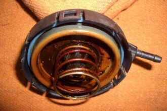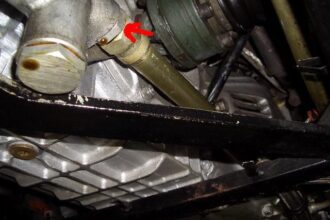 今回はVWのパサートがパワステオイルの漏れ修理で入ってきたので紹介します。 早速下回りを上げて確認した所結構漏れた跡が有りました。 漏れている箇所は赤丸の部分が酷かったです。 赤丸の部分です。 下から見てみると、カシメの…