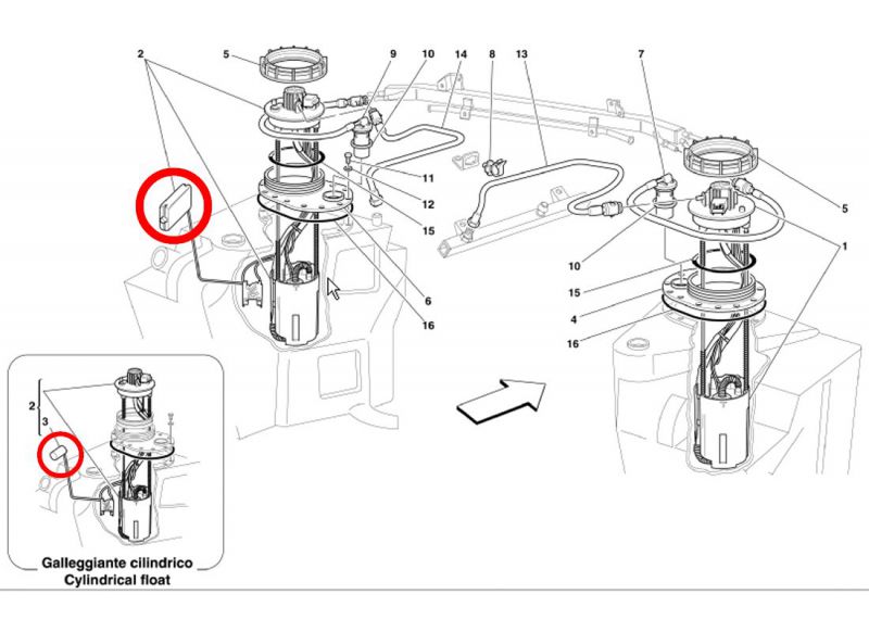 以前はフロート(赤〇)の形状が2種類あって、現車に装着しているフロートのタイプを確認しないと発注ができませんでしたが、現在は1種類に統合されております。