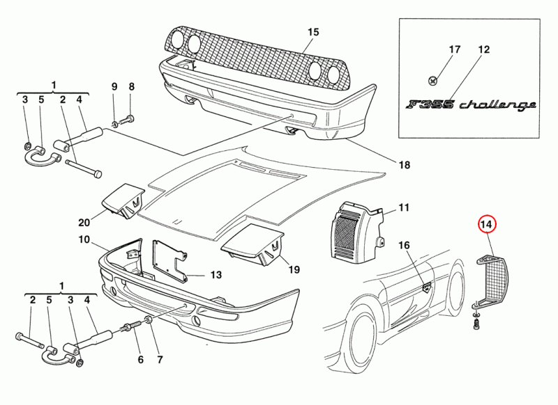F355 のチャレンジグリルというとリアのメッシュグリルがメジャーですが、こちらはドアに装着して小石などからラジエターや電動ファンを守る部品です。