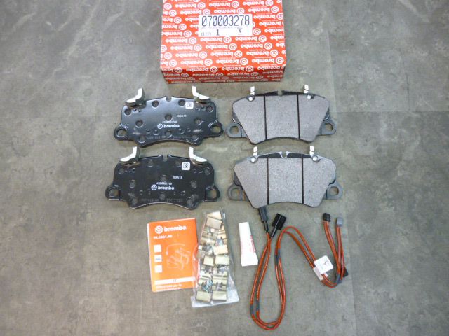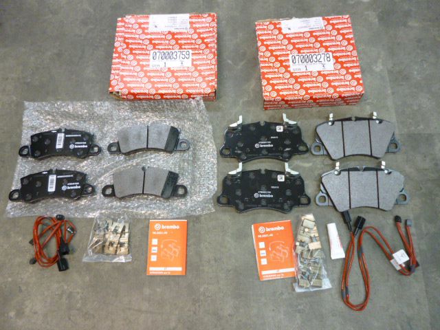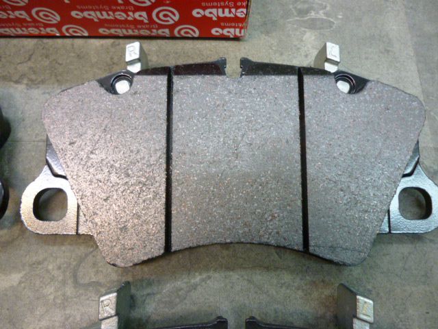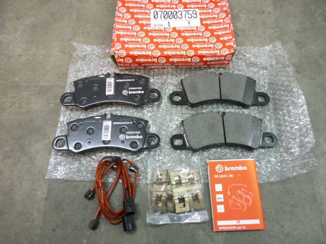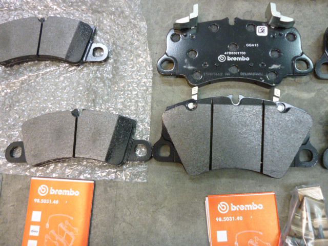 フロントブレーキパッド、リアブレーキパッドの一台分が揃いました。ご覧のとおりでブレンボ製カーボンセラミック(CCM)ディスク用となっております。