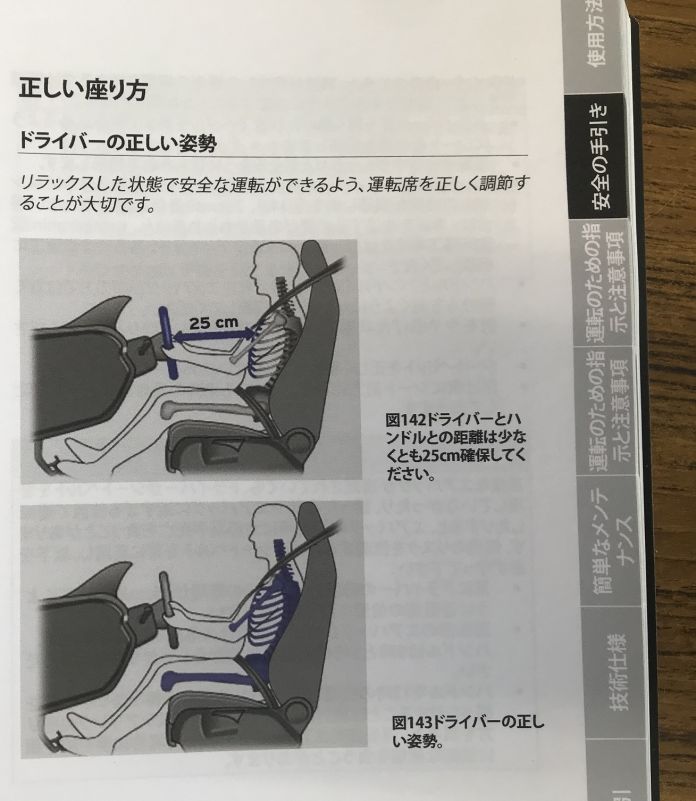 オーナーズマニュアルには、正しいドライビングポジションを骨格を用いて説明してくれます。