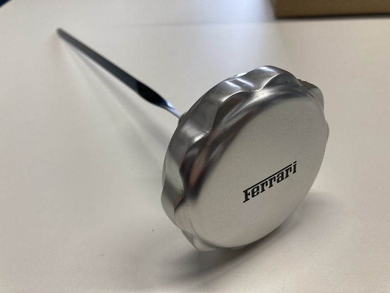 エンジンルームを開けた時に、FERRARIの文字が正面に来るように取付をしていることが拘りですよね!このアルミの感じが非常にレーシーで、なによりウェットサンプのゲージと違って短いので扱い扱いやすいですよね!