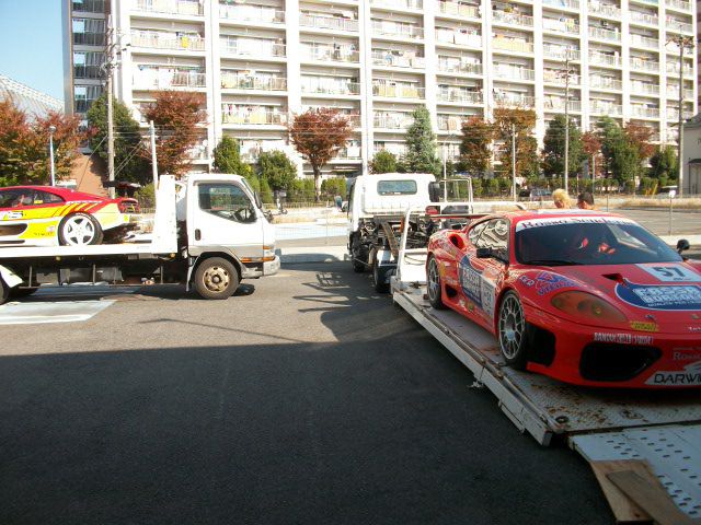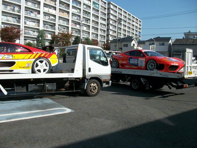 日曜日に富士スピードウェイで開催するチャレンジカップの最終戦に当社のF355とお客様の360GTを積車に乗せて出発です。