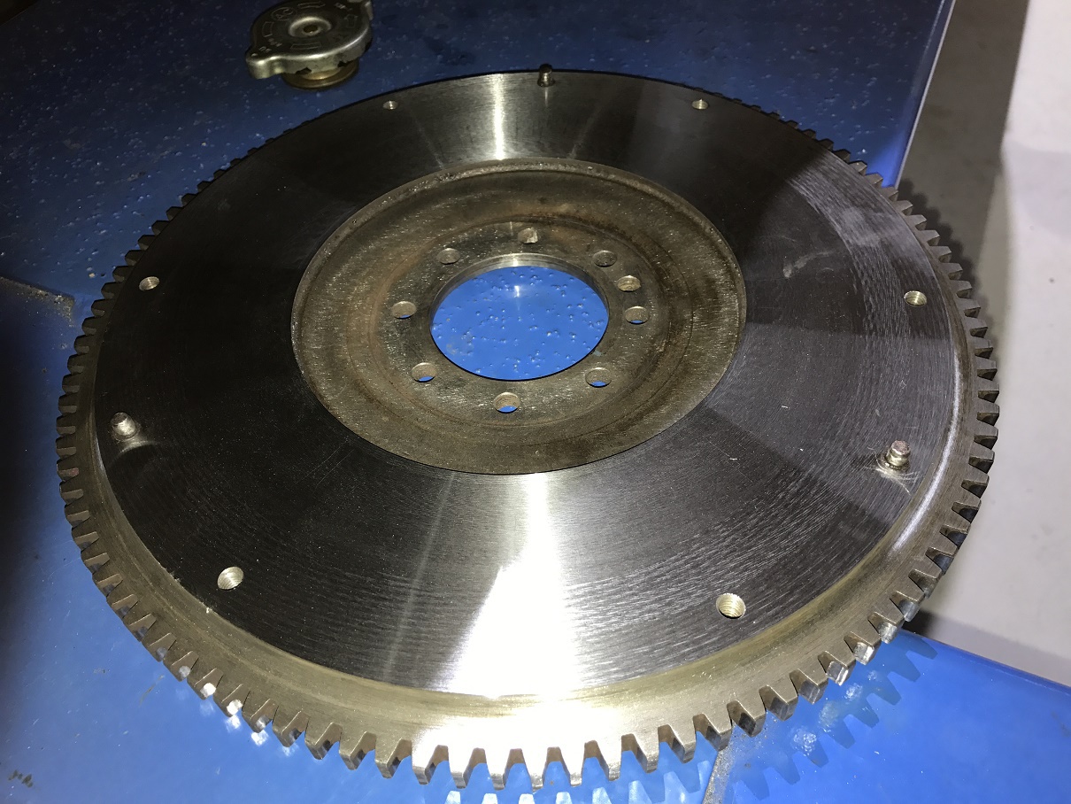 クランクシャフトの端に接続され、慣性力によりエンジン回転を安定させる役割のあるパーツです。