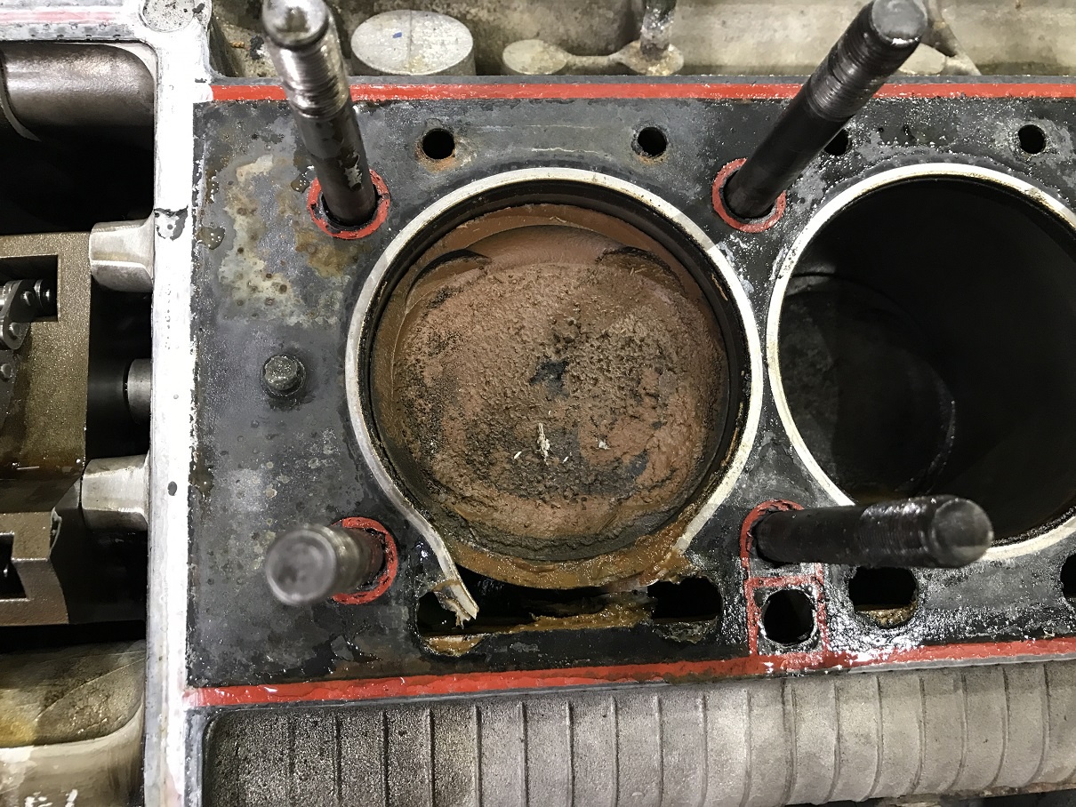 パックリと裂けております。ディアブロのエンジンはヘッドガスケットを挟む面がスカスカです。ほかのエンジンとは構造がすこし違います。