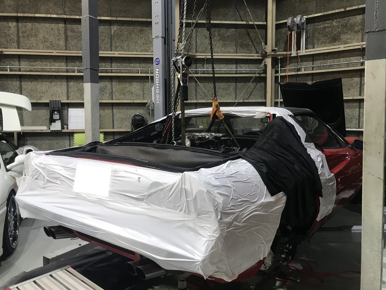 メカニックが手慣れた手つきでエンジンを降ろしていきます。