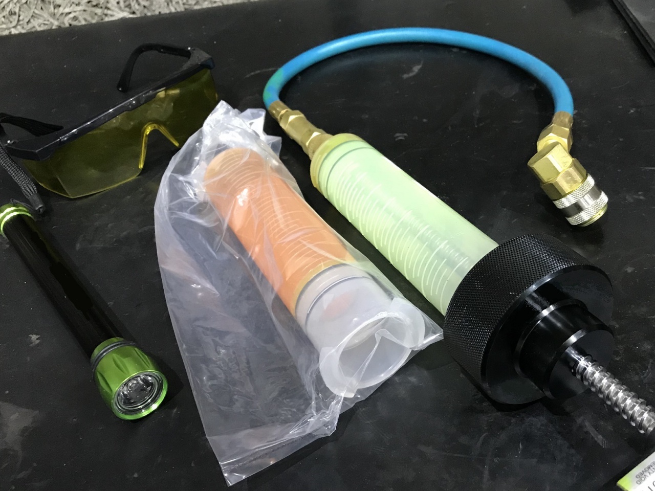 漏れた際にはガスと混ざっている蛍光剤も出てきますので、ブラックライトを照射する事で蛍光剤が照らされ漏れの有無がわかるという仕組みです。