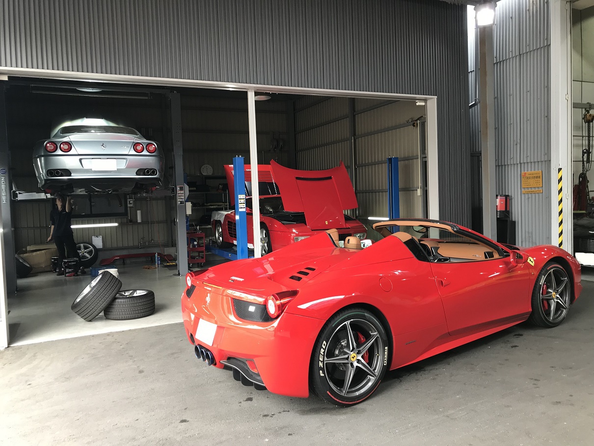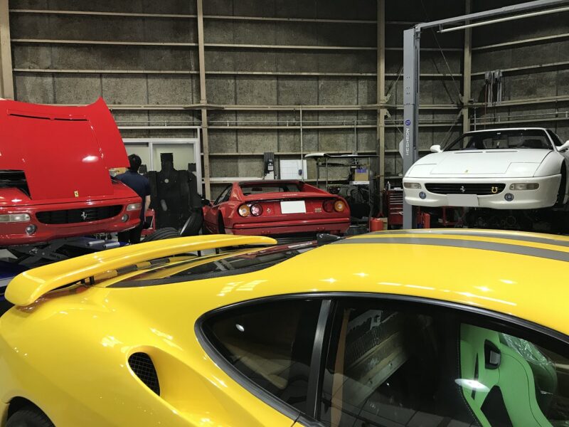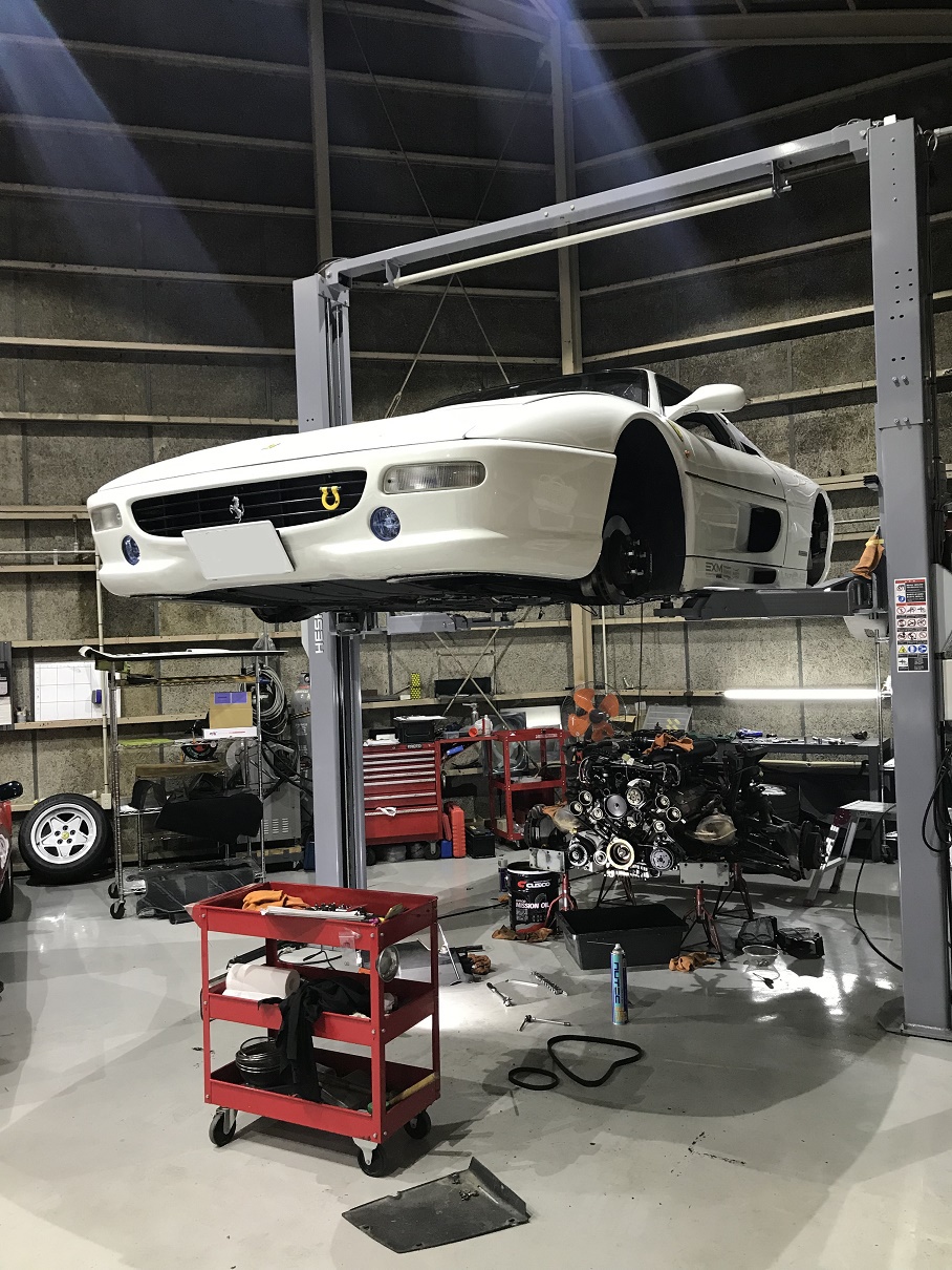 珍しいホワイトカラーのF355。エンジンが降ろされております。