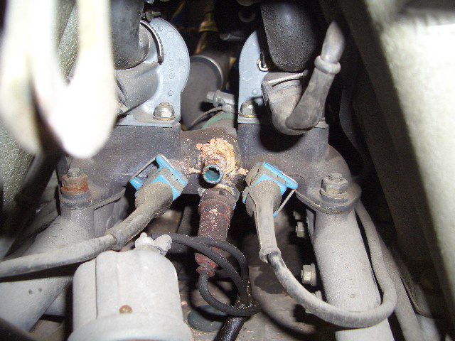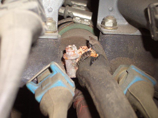 Vバンク中央から出るウォーターバイパスホースですがパンクしちゃっています。