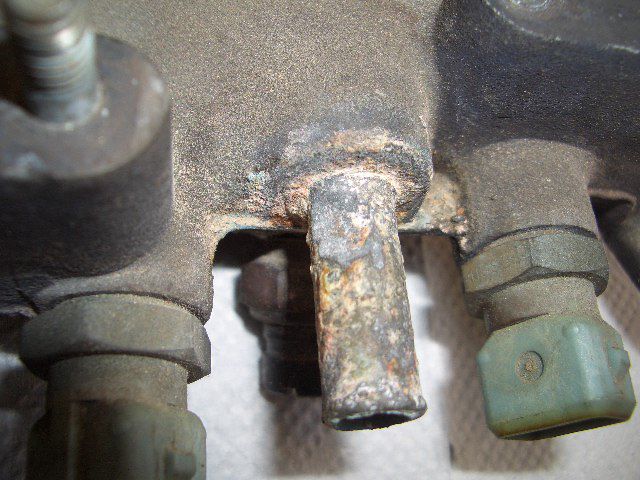 パイプがボロボロになっちゃってパイプの肉厚がほとんど無く、今にも穴が空きそうです。この部分だけの部品供給は既に無いので、ウォータージャケットごと取り外して加工修理です。