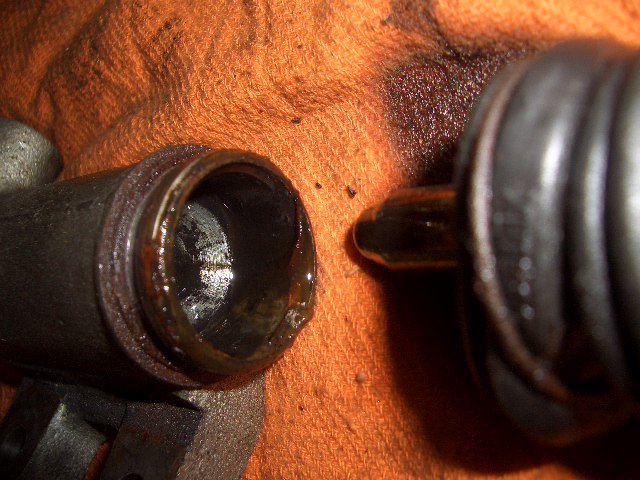 レリーズシリンダーを外してブーツを捲ってみると、シリンダーの内部はサビサビに成っちゃっていて、オイルはダダ漏れです。