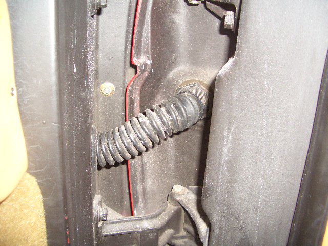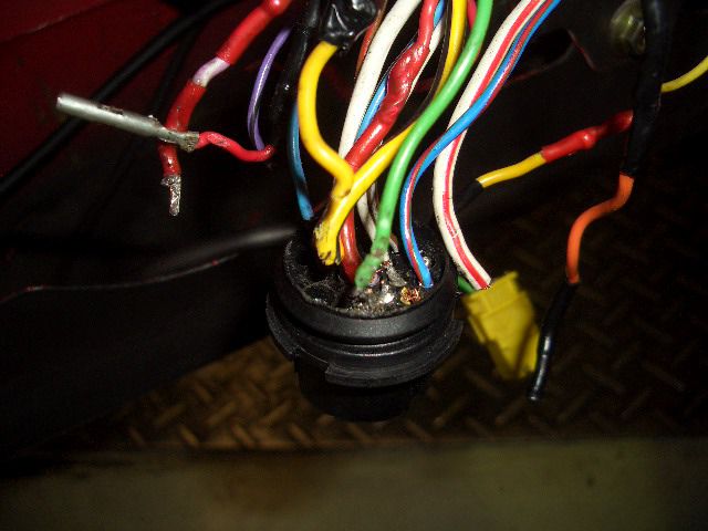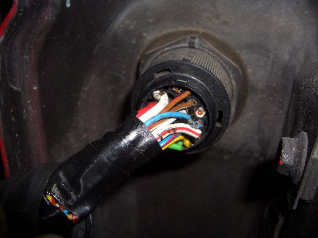 ドアヒンジの所のハーネスのブーツを捲って見ると、やはり、カプラーの付け根の部分で配線が切れちゃっています。以前に修理した跡も見受けられます。