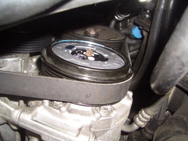 エンジンを掛けてウナリ音が出ている箇所を探って行くと、どうやらA/Cコンプレッサーのプーリーからウナリ音が出ている様です。