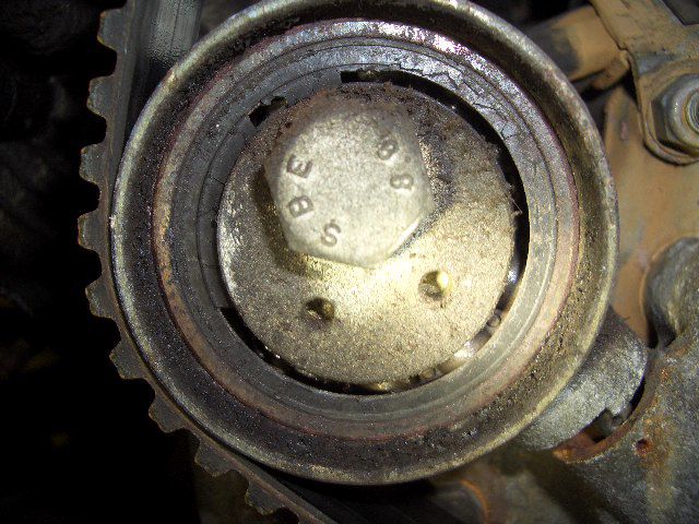 良く見てみると・・・タイミングベルトのテンショナーベアリングが焼きついて壊れてしまっています。。。