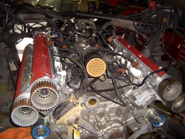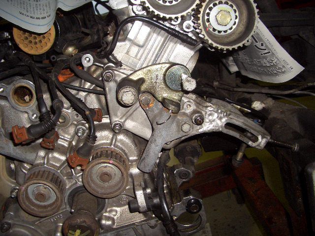 写真に写っている所がタイミングベルトテンショナーと、テンショナーベアリングの取り付けステーなのですが、最近よくあるのですが、テンショナーベアリングのステーの取り付け部分が錆やグリスの硬化で動きが悪くなっている物が多いです。ここの動きが悪いとテンショナーが適正な動きをしてくれないので、非常に問題が出てきてしまいます。
