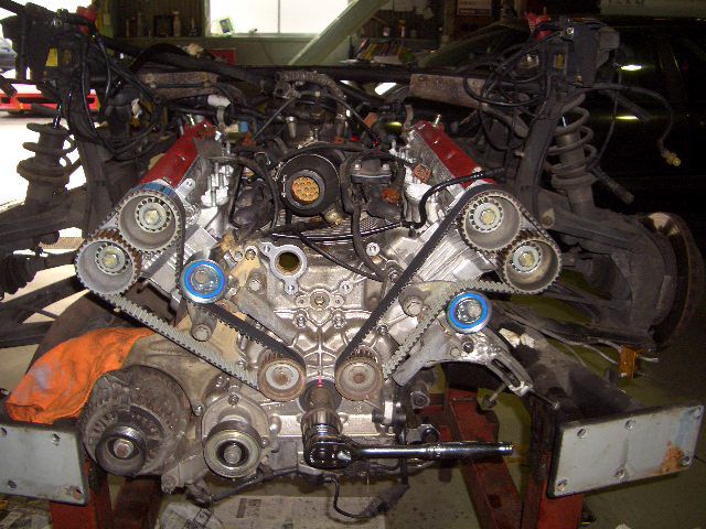 この状態で、タイミングベルトを仮付けして、バルブタイミングを調整したのですが、バルブタイミングが調整出来たら一度タイミングベルト類を取り外して、ヘッドカバーを取り付けていくのですが、今回は流れの途中で作業して行った所を紹介していきたいと思います。