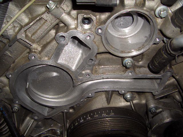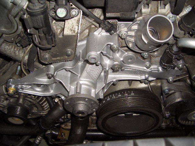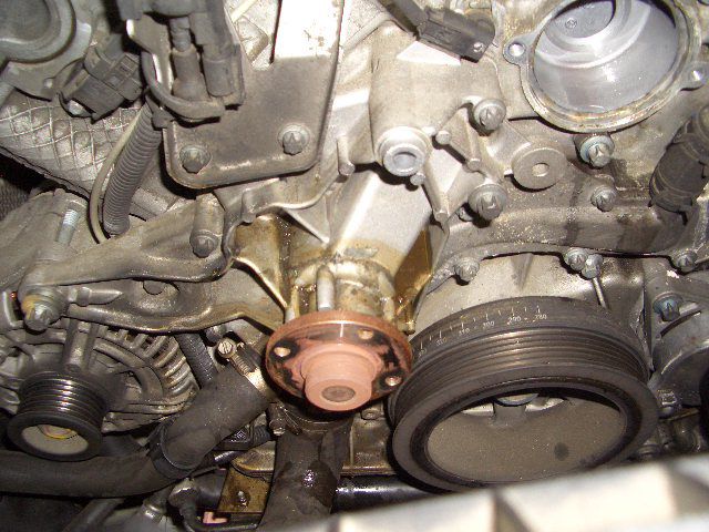 今回はメルセデスベンツE240のウォーターポンプ交換を紹介したいと思います。 こちらの車輌は走行中にエンジンルーム内からガタガタと音がするということで入庫しました。 車輌の下側からウォーターポンプを写した画像です。 LLCが漏れた跡があります。
