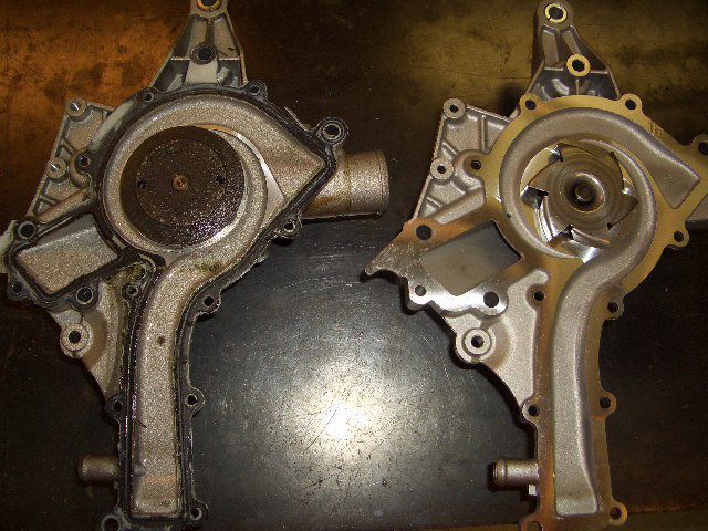 外したウォーターポンプと新品との比較です。左が外した物になります。インペラの回転の軸になるベアリングがガタガタになっていました。 年式で違うのかは解りませんが外した物と新品ではインペラの素材と形状がちがいました。 エンジンブロック側に付いてtいる古いガスケットや汚れを綺麗にして取り付けていきます。