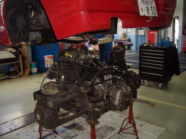 今回も前回のブログの続きでF348のタイミングベルト交換の続きになります。 前回はエンジンを下ろす直前まででしたが今回はエンジンを下ろしていきます。 合計16本のボルトを外したら慎重に車体をリフトで上げて切り離していきます。