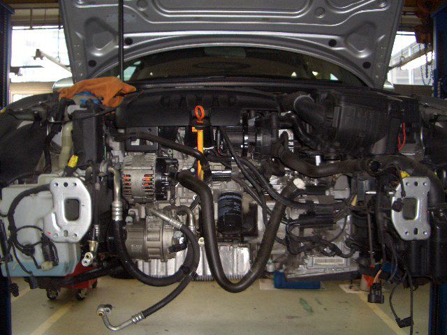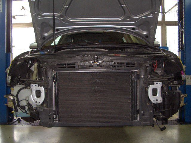 今回はエアコンのコンプレッサーがロックしてしまったアウディーです。 コンプレッサーがロックし、エアコンのラインに鉄粉などが混入しているため、エアコンラインの洗浄、 コンプレッサー、コンデンサー、エキスパンションバルブを交換します。 コンデンサーを外すためにバンパー、ヘッドライト、コアサポートを外します。ラジエーター、コンデンサーが外れると前廻りがスッキリします。