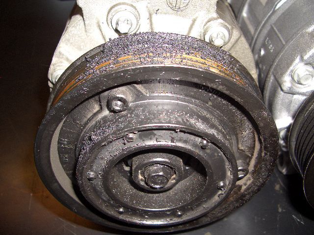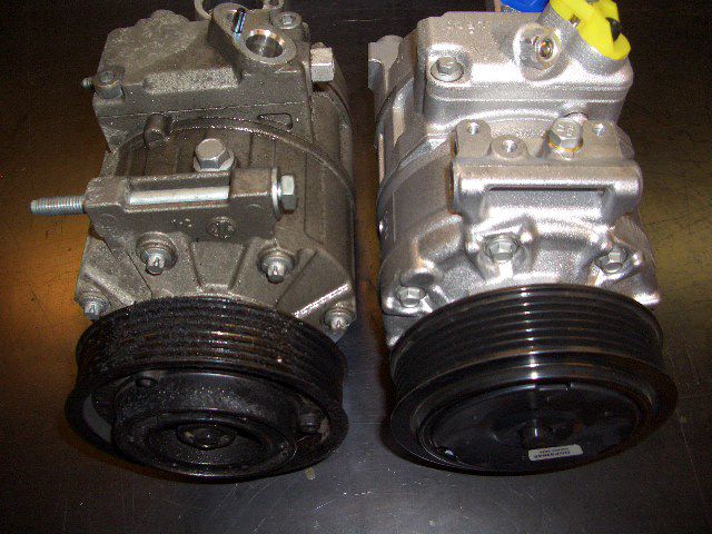 外したコンプレッサーと新品の比較になります。 ロックしてしまったためベルトが切れてしまいベルトのカスが付きオイルも滲んでいます。