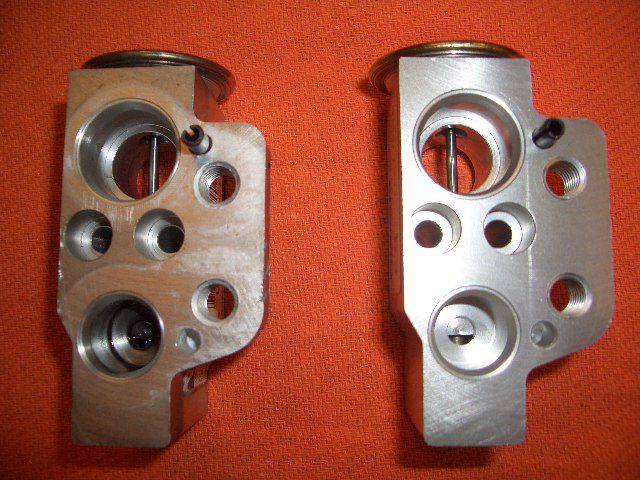 後はコンデンサーとエキスパンションバルブを交換していきます。 交換するコンデンサーとエキスパションバルブの比較の画像です。 交換部品はこれだけなのでエアコンラインの洗浄、Oリング交換、Vベルト交換、エアコンガスを補充して完成になります。