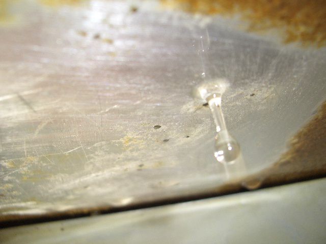 下から覗くとタンクのアンダーカバーに燃料漏れの跡があり、カバーを外して燃料タンクの保護膜を剥がして見ると、、、
