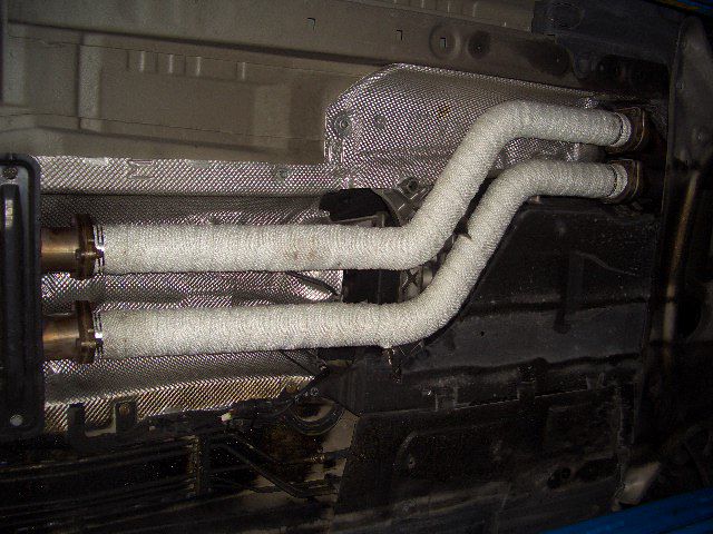 この年式辺りのBMWはマフラー触媒を弄るとビビリ音が出やすくなる為、ヒートバンテージを巻いて