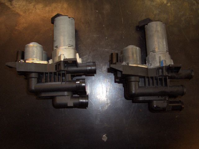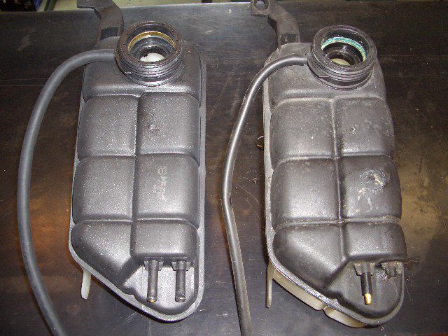 左の画像の左側がヒーターーバルブコアの新品になります。 右の画像はLLCサブタンクですが、タンクの上面に穴が開いていたり、リターンホースに繋がる部分がボロボロになっていたので一緒に交換します。