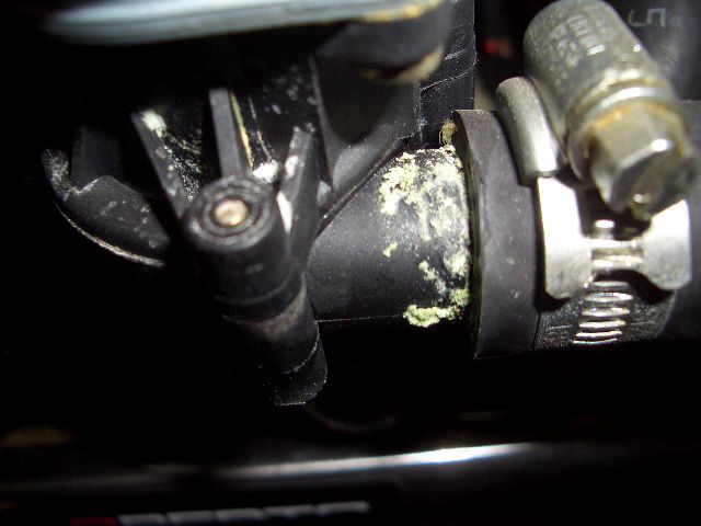 漏れ後があるヒーターホースやラジエターキャップ。