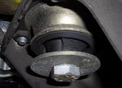 通常12ヶ月点検を行っていたら、エンジンマウントのラバーがはく離して、エンジンオイルパンとクロスメンバーが接触しているトラブルを発見しましたので、交換を行いました。エンジンは右回りに回転しているため、加速時などは右側のマウントに加重がかかり、写真のように突き出ている状態です。エンジンマウントはF355チャレンジと同じ品番168358です。パーツの費用は17,700で、ノーマルのF355とは品番が異なります。ちなみにF355でサーキット走行をされている方は、この品番のエンジンマウント(チャレンジ用)を使用すると、耐久性とリジット感がアップします。当社デモカーTWS 3号車はこのマウントに変更してあります。ご注文の際は、コーンズでは既にチャレンジ部品の供給がありませんので、当社へ「550マラネロのエンジンマウント」とご注文ください。商品購入希望の方は、ティウエスト株式会社パーツ課にて対応いたします。